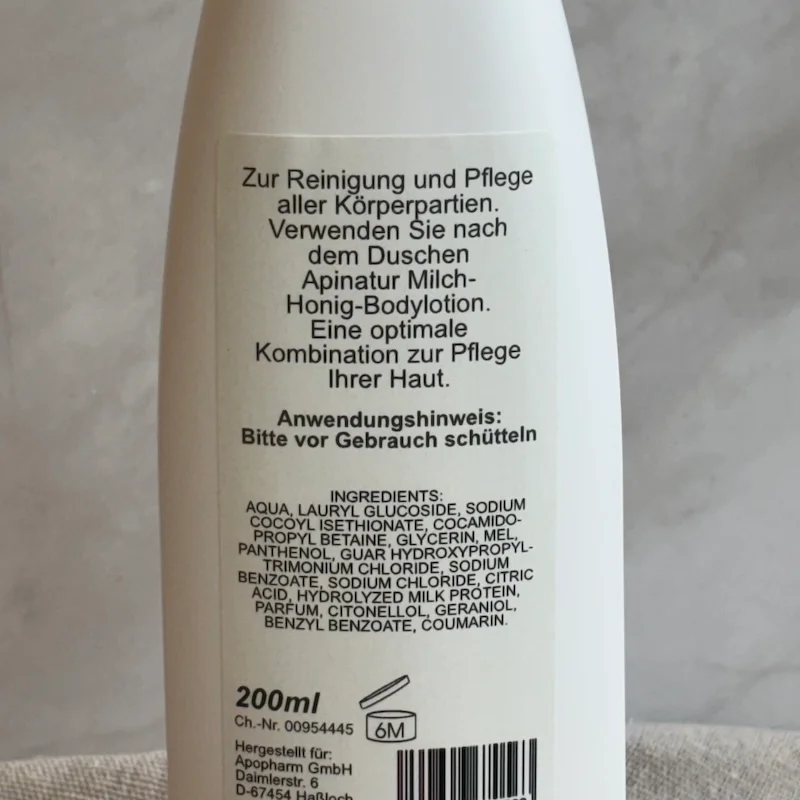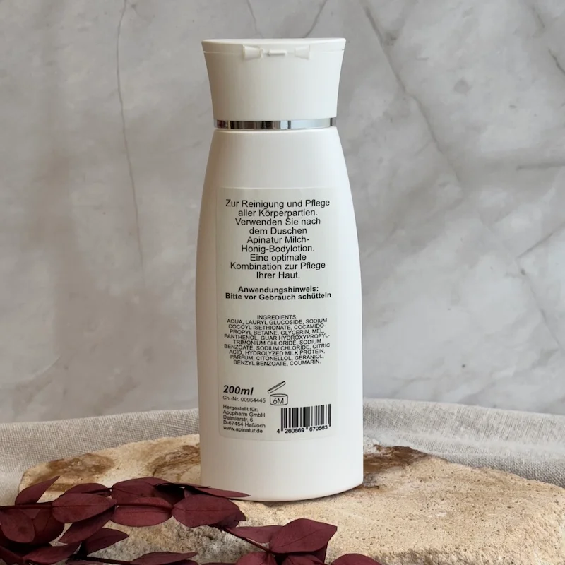 Die tägliche Dusche ist mehr als nur Reinigung – sie ist ein Moment zum Durchatmen, Ankommen und Wohlfühlen. Die Apinatur® Cremedusche Milch-Honig verbindet sanfte Reinigung mit pflegenden Inhaltsstoffen aus der Natur. Die cremige Rezeptur mit Milch, Honig und Panthenol unterstützt die Haut dabei, Feuchtigkeit zu bewahren und sich nach der Reinigung angenehm geschmeidig anzufühlen.
